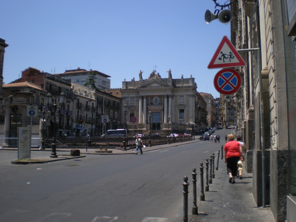 56 ← Previous Next → Walking up to a church in the middle of Catania that has some amazing ancient Roman ruins in front of it